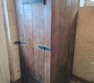 Grand coffre à céréales en chêne. Dimensions 2m par 0,86 et 0,86. Il est posé en verticale sur la photo pour des questions de place mais il se pose en longueur. A enlever sur pl