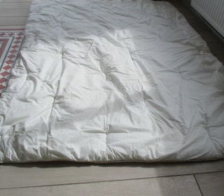 Couette marque BOUCHARA, trés épaisse, pour une personne dimensions 2m/1,50, avec housse (au choix) bleu marine : 1 coté fond blanc avec noeuds bleus marines, 1 coté avec des rayur