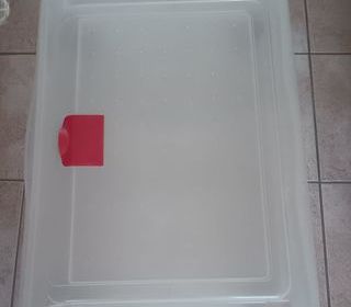 Boite de rangement à roulettes. Se glisse facilement sous le lit. Mesure intérieure : 76x54 Mesure extérieure : 80x58 hauteur : 17 cm. Il y a une trappe sur le couvercle qui pe