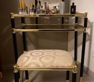 Vend petite table TV sur roulettes avec étagère inférieure de couleur brune. Bon état général. Dimensions : longueur : 58 cm largeur: 36,5 cm hauteur : 67 cm.