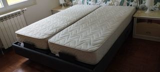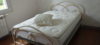 Ensemble de 2 lits bois clairs complets. 2 Matelas, 2 de tables de chevet et 2 lampes de chevet très peu servis. Enlèvement sur place.