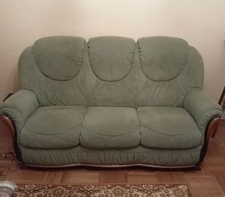 canapé en tissu vert clair non convertible longueur : 1.90 largeur ; 90 assisse de 50 + 1 fauteuil don d'un deuxième fauteuil