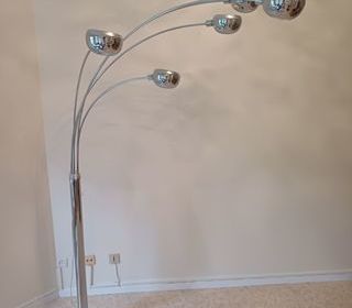 Lampadaire de salon sur pied, ampoules LED, consomment peu. 5 branches en métal chromé orientables pour modifier le design à volonté. Pied stable en marbre blanc. Interrupteur acce