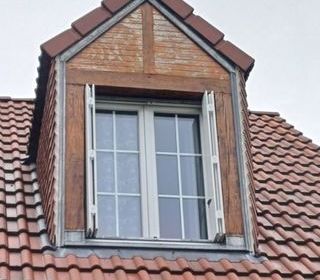 2 ensembles de persiennes bois pliantes 6 vantaux à projection cadre acier zingué. Sous couche peinture traitement classe 3 recouverte de 2 couches peinture blanche. Protège du s