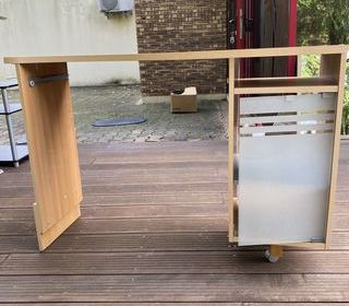 une table basse de salon en verre et bois. 1mx1m au milieu rangement pour verres et bouteilles bon état valeur neuf 745€ a prendre sur place paiement en espèces