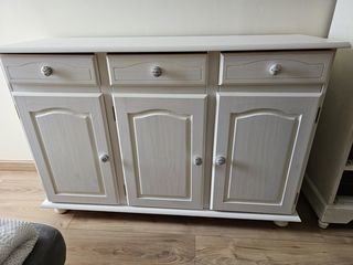 Buffet en pin massif 3 portes et 3 tiroirs marque Inter Link, modèle Livio, acheté sur Amazon et encore disponible au prix de 230 €. Hauteur 87 cm Longueur 130 cm Profondeur 43