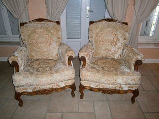 2 fauteuils en tissus et armature bois massif coussins déhoussables par fermeture éclair largeur 85cm profondeur 100cm hauteur 98cm Très bon état Prix de la paire 60 euros