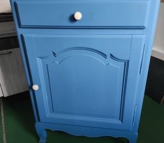 Vends confiturier en chêne massif Peint en bleu Poignées boutons bleu et blanc Un tiroir Une étagère tapissée avec papier bord de mer lavable Hauteur 1.045 m Longueur 0.74 m