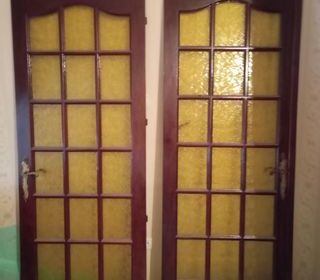 2 portes d'intérieur en bois massif verni avec petits carreaux en verre teintés jaune très bon état hauteur 200 cm largeur 72 cm à retirer sur place.