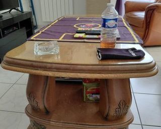 Table basse sur roues conçue pour mieux se déplacé - Couleur sur l'entourage en blanc cassé et le dessus couleur bois clair , avec un verni sur tout le meuble . Dimensions / Haut