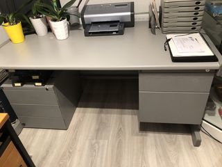 Bureau en métal de couleur grise, équipé de deux caissons latéraux pour le rangement. La surface est spacieuse et lisse, idéale pour un espace de travail ou d'étude. Présente une s