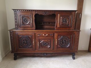 Buffet style basque en chêne massif en bon état Bas longueur : 220 cm profondeur : 51 cm hauteur : 104 cm Haut (sur meuble) longueur : 198 cm profondeur : 35 cm hauteur : 60 cm