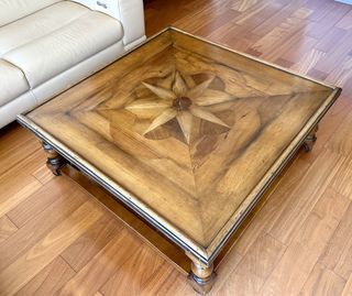 Vends superbe table basse carré en bois massif. Plateau décoré d'une marqueterie en " Rose des Vents " Meuble de qualité, chaleureux, robuste et stable. Très bon état général.