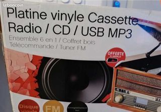 Système complet nostalgie avec tourne-disque, lecteur CD (MP3), port USB, entrée auxiliaire, cassette et tuner radio FM/MW. Fonction d'encodage direct : enregistrement de disque, C