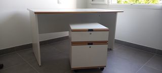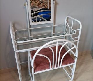 La coiffeuse est en métal blanc et deux plateaux en verre, 74X35 avec son assise. Le tout est en en parfait état sans impact.