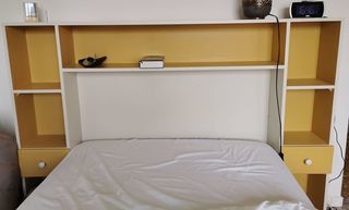 Une tête de lit fabriquée sur mesures, façon cosy, quasi neuve, moderne et en très bon état, en bois de PIN MASSIF, peint blanc et jaune ocré. Avec un dos (non massif) peint en bla