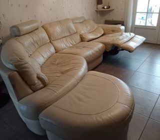 Vends canapé d'angle en cuir beige avec pouf et têtières Dimension totale 295X 101X 145 , structure en bois Cuir vachette, relax électrique sur une place Quelques usures sur l