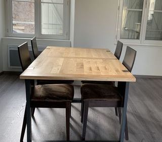 Table design bois massif traité & acier peint gris ardoise, excellent état (valeur neuf 1080 euros) avec 4 chaises design en bois wengé, assise rembourrée suédine traitée anti-tach