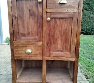 ? ou buffet ou meuble d'appoint : le fait à noter est qu'il est dissymétrique. Des années 70-80. Utilisé pour le rangement de la vaisselle. Nettoyé, réparé, teinté, verni. Les bo