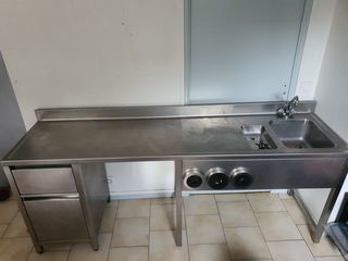 Table murale comptoir inox. Dimension 2269*600*860 mm INOX AISI 304 épaisseur 2mm avec oméga de renfort Bloc intégré comprenant : 1-tiroir et 1-porte,1-marc à café 1-espace ouv