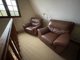 Canapé et deux fauteuils en cuir cognac. Bon état. Prix neuf 4000 euros.