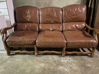 Salon vintage, en cuir et chêne 1 canapé (ne fait pas lit) 50 € 2 fauteuils 30 € Le tout pour 70 € A prendre à Saulieu Accès et chargement faciles