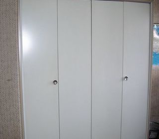 Disponible pour Bureau Classeur. Haut: 1,95 Larg 1,56 ProF . 0,42 . fermeture par 4 portes K Z . 3 séparations verticales ; 36 tablettes. . Très bon ETAT ; fabrication artisa
