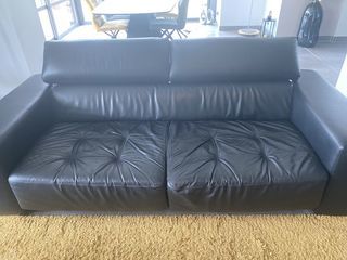 Canapé en cuir Couleur noire Fabrication italienne Larges assises 3/4 places 2 têtières réglables Surpiqûres noires Pieds bois et métal