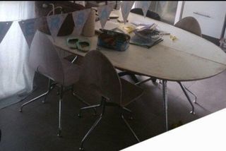 Long de 2m largeur environ 1m50 Forme Oeuf (quasi ovale) Blanc cérusé Peut accueillir 10 convives.