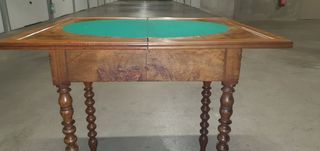 ancienne table de jeux pliable, très beau travail , avec tiroir . la table peut servir de décoration ainsi, ou être restaurée pour plus d'utilisation.