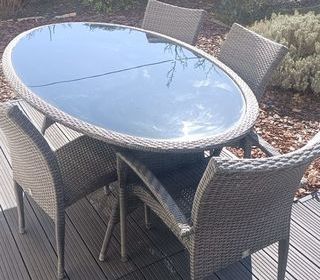 Salon de jardin osier marron gris plateau en verre 180x107 4 chaises 2 fauteuils excellent etat