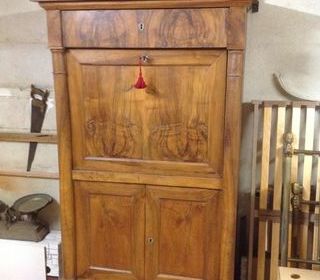 Secrétaire style Empire en bois fruitier . 1/2 colones , 1 tiroir en haut + 2 portes en bas Sans marbre H: 1,67 . L: 0,92 . Prf: 0,36 Dans le secrétaire 3 étagères + 3 tiroi