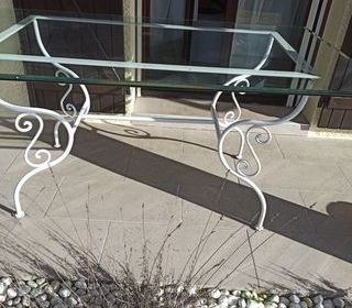 vend table plateau en verre biseaute tres epais, armature fer forgé. Pouvant aller aussi bien dans un salon qu'à l'extérieur longueur 1,60 largeur 0,94 hauteur 0,74