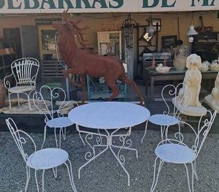 Salon de jardin en fer année 1950/60, une belle table 2 jolie chaises et 2 beau fauteuils. L'un des fauteuils à un dossier à ressouder légèrement. Table : Ht. 71cm x Di