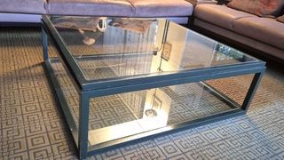 table basse carrée, 2 plateaux en verre superposés avec monture en bois gris foncé sapin; dimension 100 x 100 cm; hauteur: 34 cm