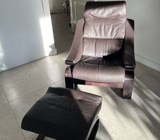 lot de 2 fauteuils et repose pied ROCHE BOBOIS en cuir et monture bois bon etat valeur neuf 2000e l un cede a 1OOO e les 2