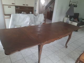 Vd table de salle à manger avec 2 rallonges Dimensions 1m47 sans rallonge et 2m63 avec les 2 rallonges en très bonne état Et 6 chaises état correct Le tout à 80E