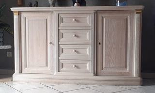 Bahut 4 tiroirs , 2 portes chêne massif, cerusé rose pâle,