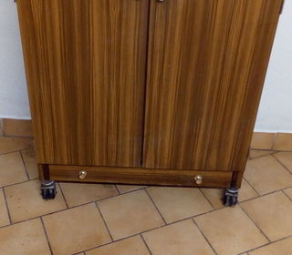 Meuble à chaussures à roulette ou commode basse avec tiroir bas, hauteur 89 larg 76,5, profondeur 34. Feuilles en plastic de protection des tablettes à garder ou à changer. A prend