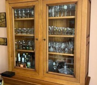 2 corps haut : 2 portes vitrées bas : 2 tiroirs + 2 portes partie basse du vaisselier : largeur à la base (niveau pied) 131 cm, au niveau du plateau 127,5 cm, hauteur 91 cm,
