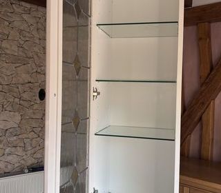Meuble de cuisine vitré ( vitraux ) à poser sur socle En bois massif (cuisinella ) Blanc 3 étagères en verre Dimensions Hauteur 125,5 cm Largeur 40 cm Profondeur 37,5 cm à€ retir