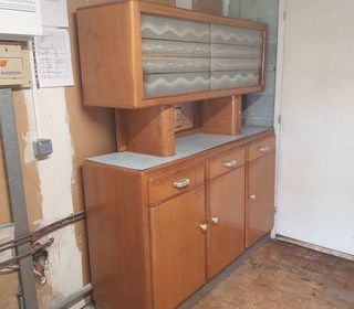 beau meuble année 1960 couleur bois et formica bleu longueur 1.60 largeur 0.54 hauteur 1.81 démontable en deux partie