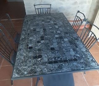 TABLE MARBRE 160 cm X 0,90 cm neuve avec jolis pieds et 6 chaises avec galettes traitées anti taches déhoussables et lavables.
