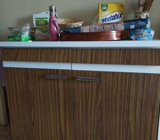 Vends meuble en formica à deux tiroirs et deux portes en bon état. Largeur: 1 m, profondeur : 50 cm, hauteur 83,5 cm