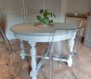 Table de salle à manger, diam 120X110 cm plus une rallonge intégrée de 50 cm. Entièrement repeinte en cabine par un professionnel, plateau gris foncé et pieds gris clair, il y a tr