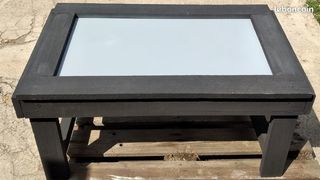 Table basse artisanale ,couleur noir et gris , avec un dessus du plateau blanc . Dimensions Hauteur 51 cm et Longueur 104 cm avec Largeur 62 cm . Possibilité plus me joindre tél .