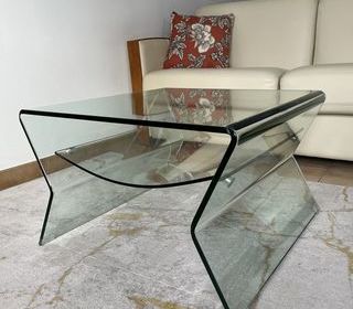 Etat neuf aucune rayure ni éclat. Dimensions : 65x65 cms Hauteur : 41 cms Epaisseur du verre de la table = 12 mms Epaisseur de l'étagère amovible = 8 mms à€ venir chercher s