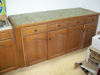 A vendre 3 meubles de cuisine en chène avec les pieds et 2 plans de travaille à carrelet, chaque meuble a deux portes et deux tiroirs,longueur 0,80,profondeur 0,60, un total de 2