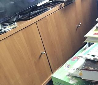 Meuble long mélaminé bois 3 portes , une étagère à chaque porte. 170 cm de long, 80 cm haut et 48 cm large au plus fort.