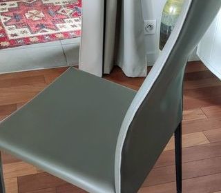 4 chaises en cuir couleur gris taupe avec coutures ton sur ton de la marque Airnova achetées chez Roche Bobois . Elles conviennent aussi bien pour un intérieur moderne que plus cla